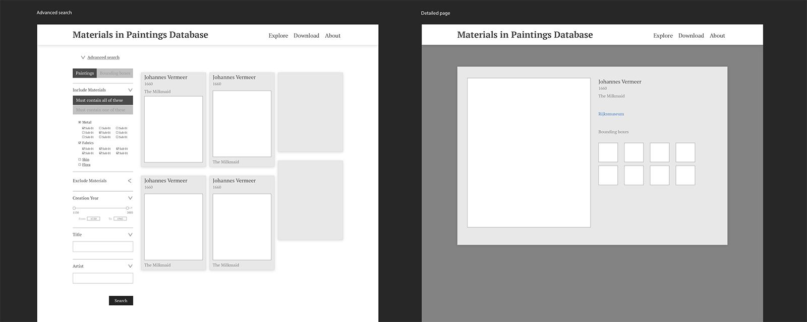 - Detail page showing title, artist, bounding boxes, link to the original museum repository and download button